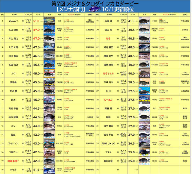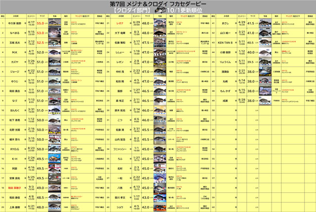 メジナ部門・クロダイ部門、10/1更新順位発表(9月分集計)。