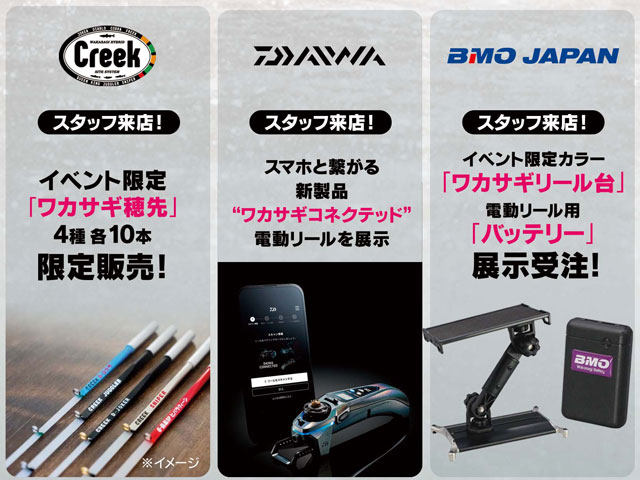 クリーク、MTCW、ダイワ、BMOジャパン、ホンデックスよりメーカーテスターやスタッフが来店&ブース常駐!商品の選び方や使い方など、お気軽にご相談ください!イベント限定品、イベント限定カラー品などの販売や受注も予定しています!