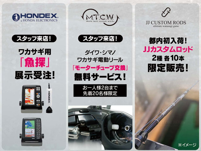 さらにワカサギ聖地桧原湖にて活動するワカサギ穂先のご当地ブランド、JJ CUSTOM RODSより都内初入荷!JJカスタムロッド2種各10本を限定発売また、テスターやスタッフの来店はありませんが、シマノ、バリバスのワカサギ商品展示も予定しております。ワカサギファンの皆様、お誘いあわせのうえぜひご来店ください。