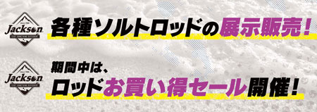 イベント期間中、展示ジャクソンロッドのお買い得セールを開催します!メーカー指定のソルトロッドを驚きの価格で販売予定!!このチャンスを是非ともお見逃しなく!
