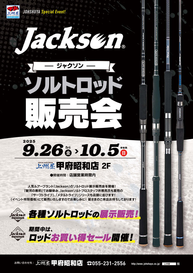 2025年9月26日(金)~10月5日(日)の10日間、上州屋甲府昭和店にてジャクソン・ソルトルアーロッド展示販売会を開催します!