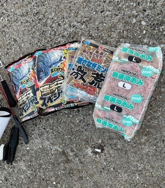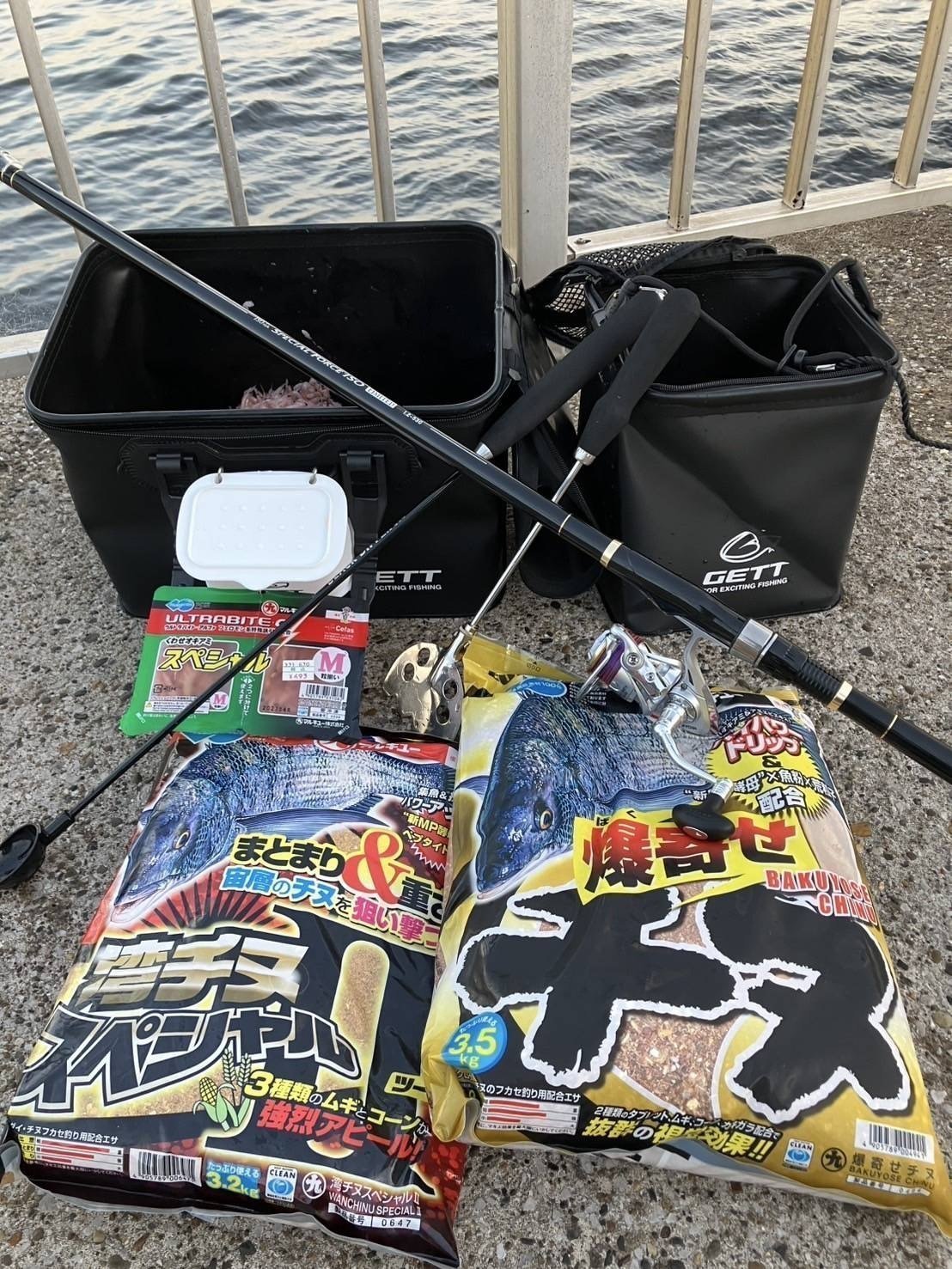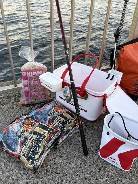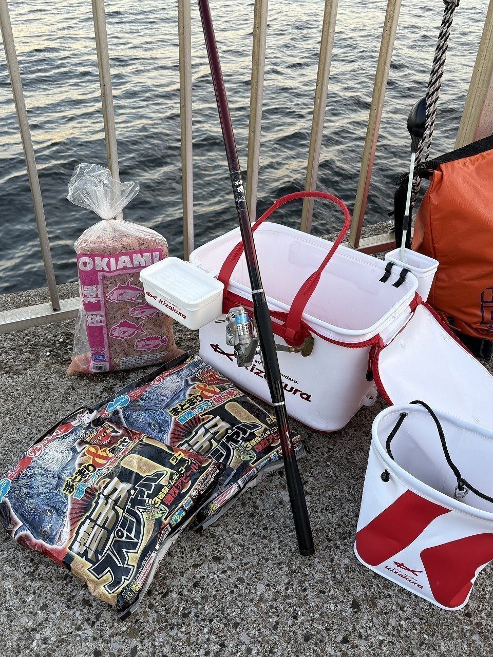 今回は、ウキメーカーのキザクラさんから、人気の円錐ウキ「Iスタイルシリーズ」と「キザクラバッカンセット」をレンタルして頂き、エサメーカーのマルキューさんからは、湾内でのクロダイ狙いに効果的な「湾チヌSPⅡ」をご協賛いただきました。