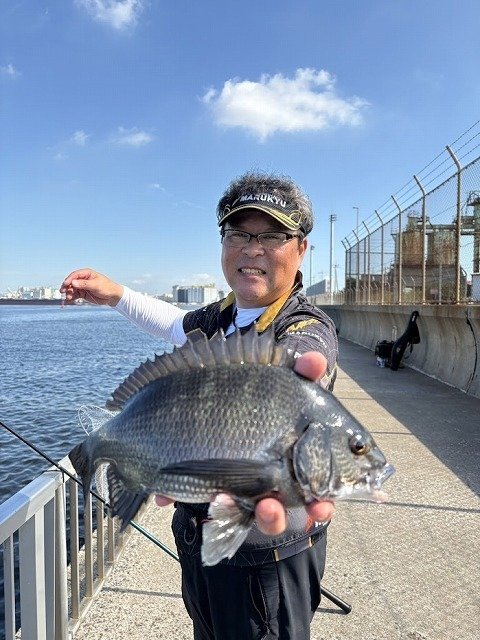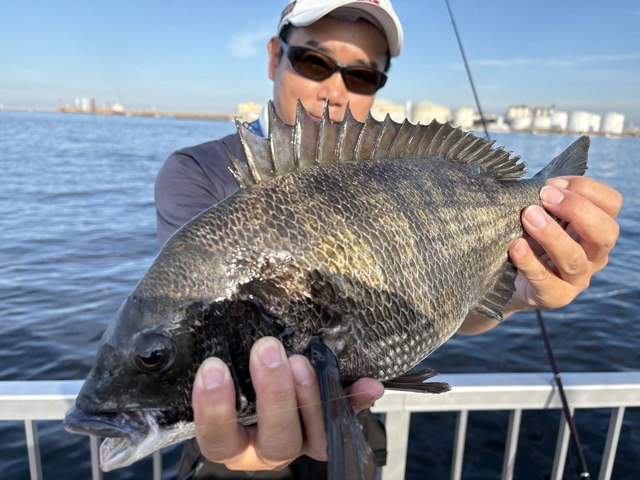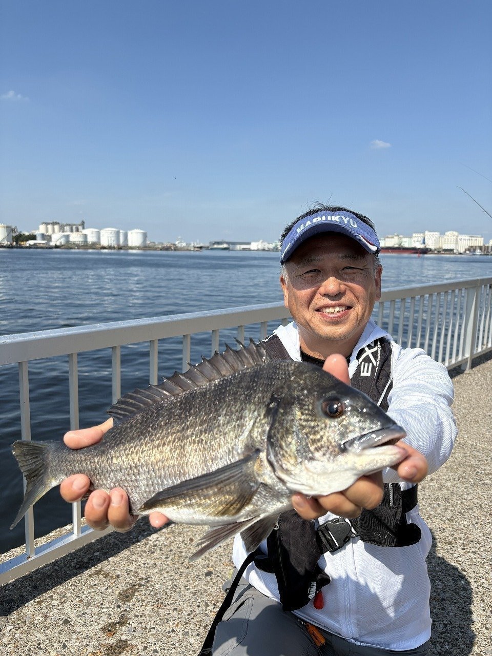 朝イチに「フカセ釣りマイスター」川越店鈴木店長より、エサ作りのレクチャーを受け、いざ釣り開始♪コマセを撒いて約30分後、チヌからのアタリが出始めて無事に本命クロダイをゲット!