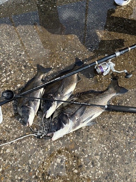 コマセを撒き始めしばらくすると、満潮潮止まり前に立て続けにクロダイが釣れその後バラシや根掛かりボラが釣れつつも本命が上がり最終的に4人でリリースも含めクロダイ6・ボラ2といった釣果に恵まれた釣行会となりました。