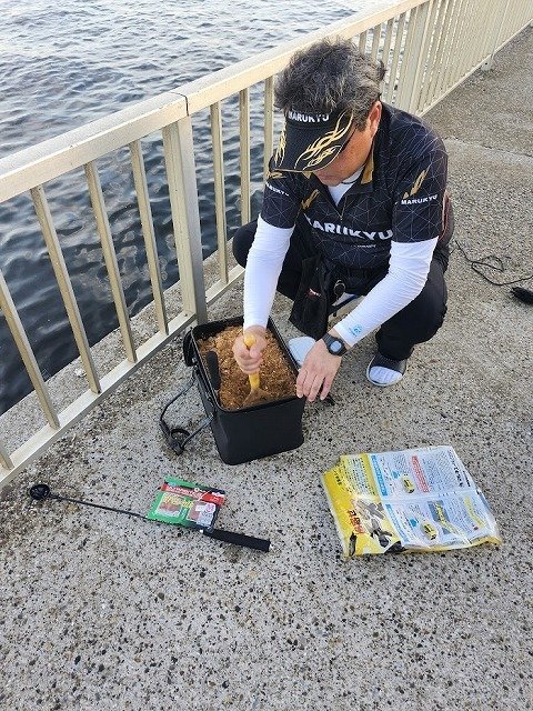 釣場に到着後、まずは川越店の磯釣りマスター鈴木店長より配合エサの混ぜ方・作り方や仕掛け釣り方などを教えて頂き実釣開始。