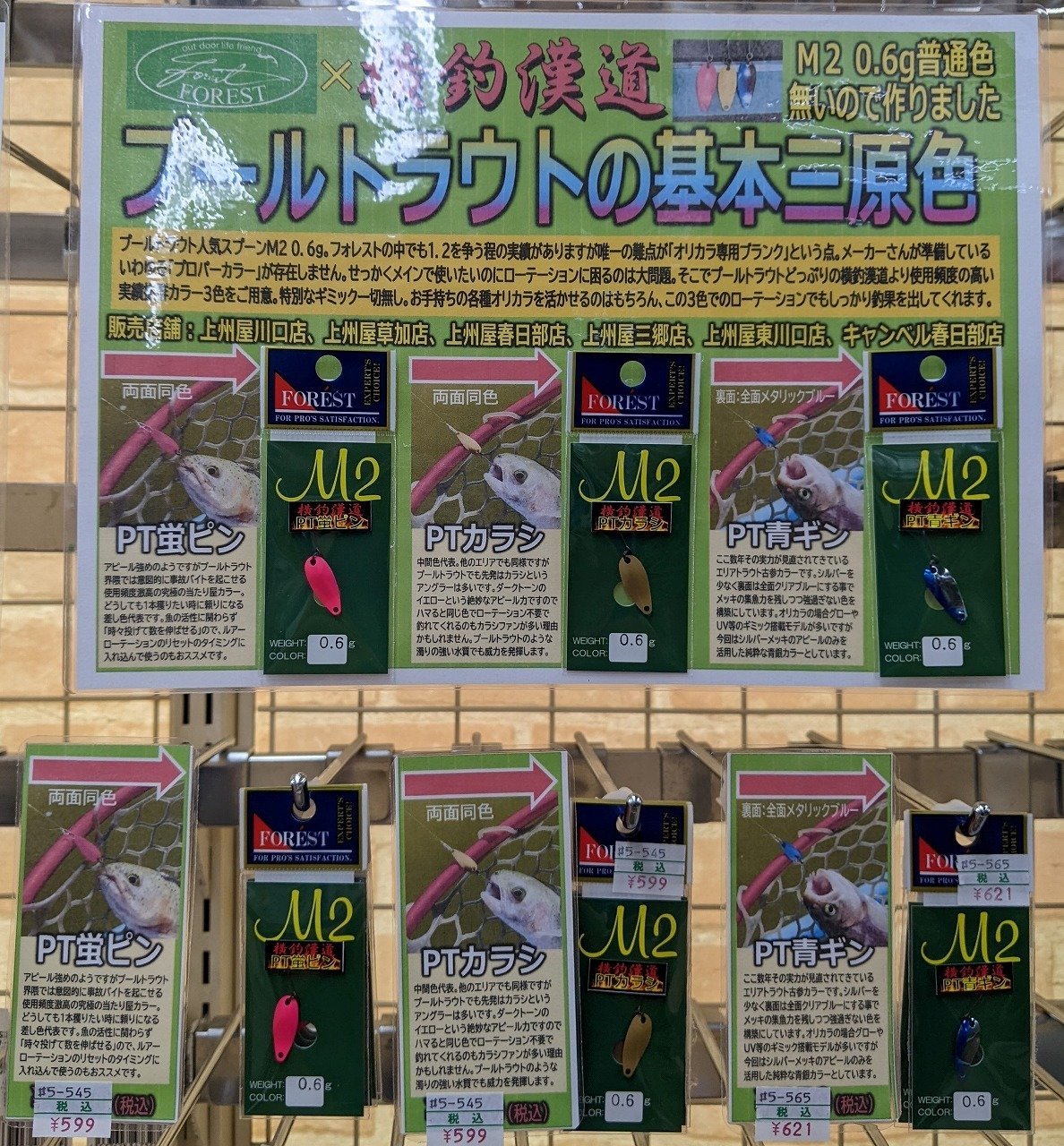エラトラウト釣行会でOyamaWaterPark遊水園さんへ行ってきました!今回はFOREST×横釣漢道の限定アイテム『プールトラウトの基本三原色』M20.6gの試釣です。M20.6gはオリジナルカラー専用ブランクとなっていて通常販売されていないアイテム。PT蛍ピン・PTカラシ・PT青ギンの3色はオリカラではあまり見かけないけど絶対外したくない普遍的なカラーとなっています。実釣では手堅く全色でミッションコンプリート!やっぱり釣れますね~(*´▽`*)そして遊水園さんの魚は全てブランドニジマス『頂鱒』で激ウマですので是非お持ち帰りを!お刺身で食べられるのは釣り人の特権です。オリジナルカラーのM20.6gは東川口店・川口店・草加店・春日部店・CB春日部店にて好評発売中ですので是非チェックしてください!