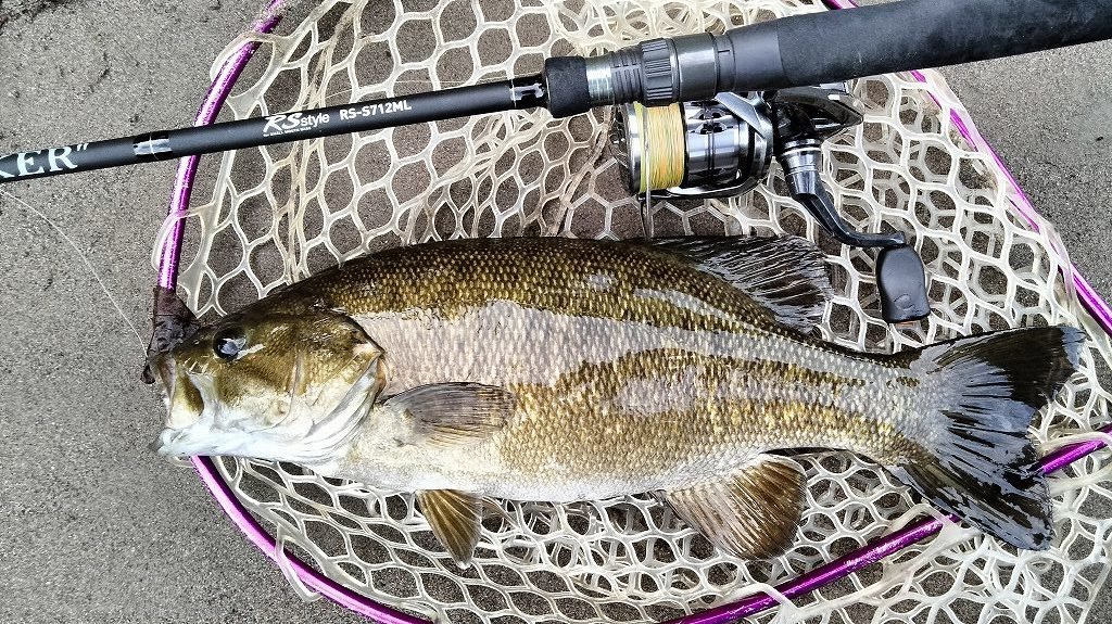 朝一トップから始めるも反応がなく、ソウルシャッドSSRに変えるとコバスがヒット。その後フラットワームでコバスを追加後ゴロタ場に移動します。デスアダー6インチのテキサスリグでコバス2匹と35cmを釣って流れの早いポイントに移動。ヴァラップスイマー4.2のウェイテッドリグで30cmクラスを2匹釣って一時終了です。夕方はチビーブルで35cmとナマズ追加後、カバースキャット、ドライブビーバー3.5、フラットワームで数を重ねます。最後に流れの絡む場所で4インチカットテールのスプリットショットで42cmを釣って終了です。RSスタイル712MLはPEライン使用でぶっ飛び、好感度でオススメです。ルアーも小型シャッドからパワーミドストまで幅広く使えるので、川バスハイシーズンのスピニングはこれ1本でいけます。