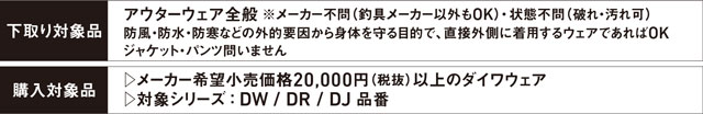 メーカー問わず、不要になったアウターウェアを店頭にて下取りに出していただくと、メーカー希望小売価格20,000円(税込)以上のDAIWAウェア1着ご購入につき、2,200円(税込)をその場で値引き!