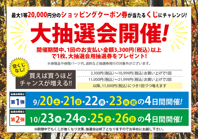 2025年9月20日(土)、21日(日)、22日(月)、23日(火・祝)の4日間開催、『オータム大抽選会(第1弾)』に参加いただける抽選券をプレゼント!最大1等20,000円分のショッピングクーポン券が当たるチャンス!こちらも空クジなし!