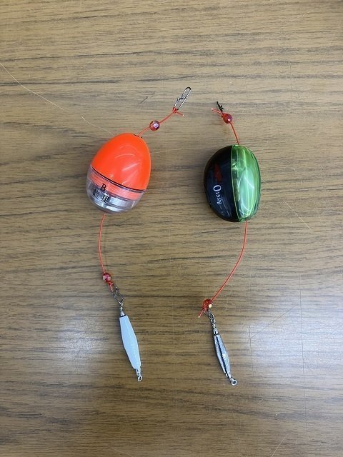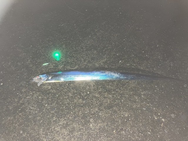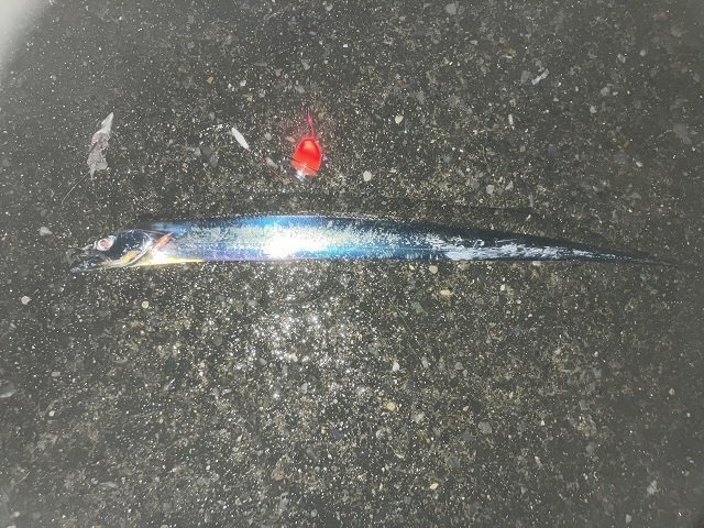 26日(日)の仕事終わりにうみかぜ公園(横岸壁)にタチウオを釣りに行きました。雨もほとんど上がり、風も無く、「今でしょ!」という事で行って来ました。仕掛けは自作タチフロートに「誘っちゃう太刀魚」。エサはケイムラサンマ。タチフロートと言っても中通しのウキを半遊動式にしてオモリを付けて沈めるだけ。今回は2タイプ用意しました。タチフロートのメリットは全層を探れるのでアタるレンジを見つけやすいという事です。こ当日はかなり手前のかなり深いところ、ボトム付近でしかアタリませんでした。アタリは頻繁にあるものの中々掛かりません。ビックリアワセ、早合わせは禁物で、アタってもアワセず耐えて、ゆっくり誘って何とか掛けて9時20分頃に上がって来たのはF3サイズ75cmの小ぶりなタチウオ。小さい魚は掛けるのが難しいのですが、その分やり取りがスリル満点で楽しいです。10時20分ごろ2匹目をcatch!その後も頻繁に当たるのに中々掛からず気付けば日が変わっていました。最後はボトムを狙いすぎて根掛かって終了。アシストフックを持っていたらもっと釣れた・・・かも。後日リベンジします。