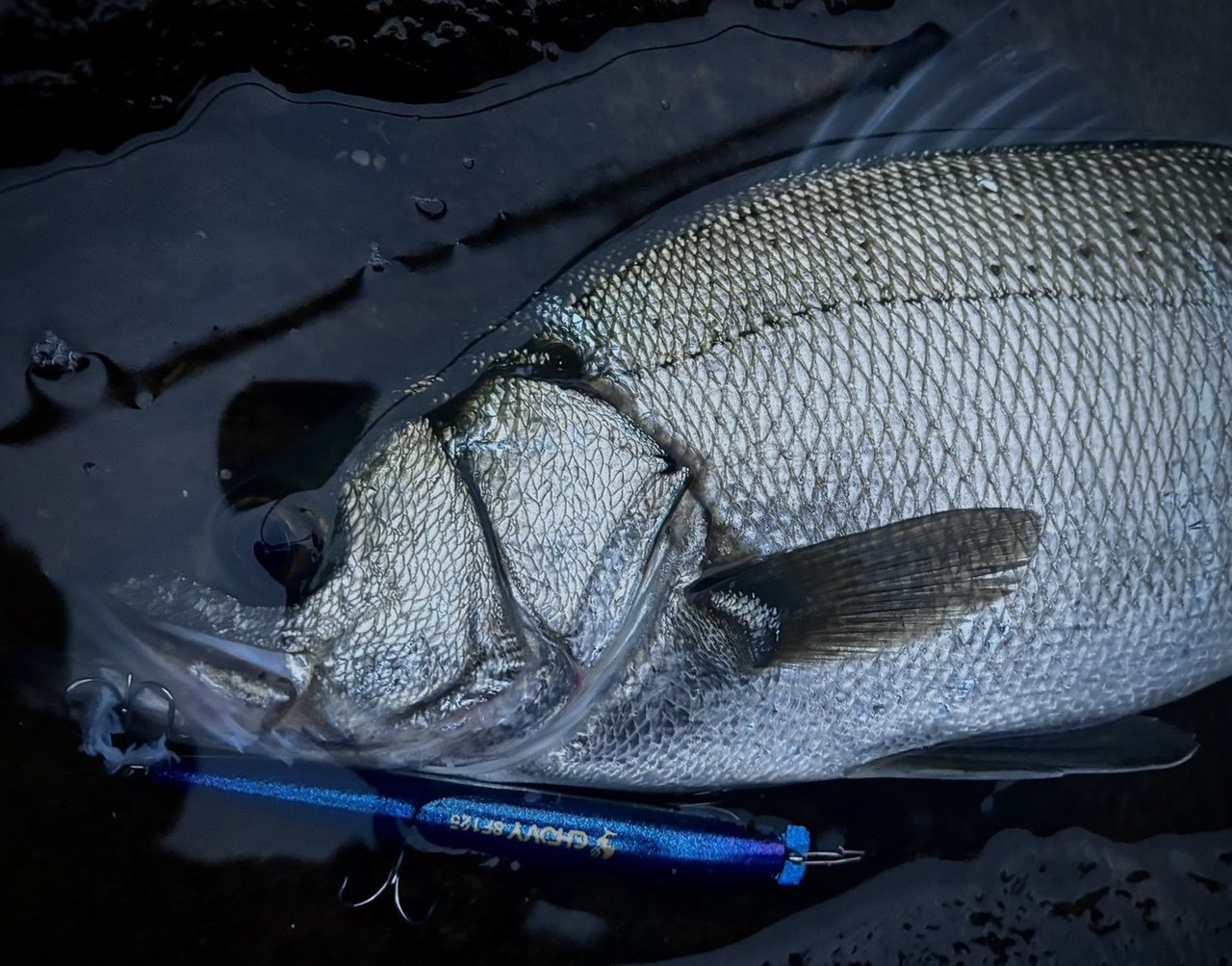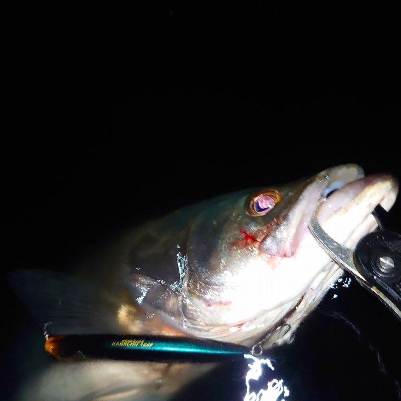 久しぶりに横浜市金沢区エリアでウェーデイングシーバスしてきました。深夜にもかかわらずアングラーはチラホラ居て例年に比べるとコノシロの密度は少なめでしたが魚っ気は有り。開始間もなく下げ止まり直前にヒットした一本目は77㌢のグッドサイズ。ルアーをハーモニカ喰いするほど活性高くファイトも中々に楽しめました。2本目は完全に潮止まりで68㌢がヒット。その後は潮の上げ始めにヒットしたのが体高のある85㌢ランカーサイズ。陸に戻って計測して十分満足していましたが、潮位的にまだ大丈夫かな~という事で戻ってキャストしていると10投位でまたヒット!これも良い引きをしてフィッシュグリップでキャッチすると中々のサイズ。計測すると80㌢のランカーサイズで計4ヒット4キャッチ、2ランカーと出来過ぎの結果となりました。