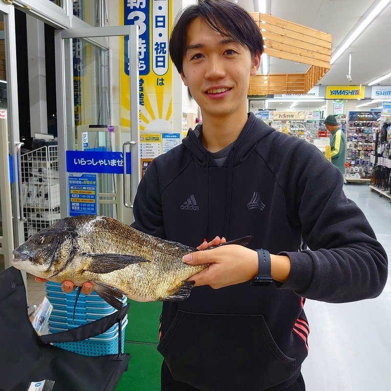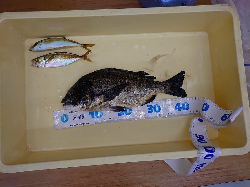 横須賀海辺つり公園最新釣果情報!午後に当店でお買い物されて釣りに出掛けた東京からお越しのNYさまが、43㌢のクロダイと22㌢のアジ2匹を釣り上げて帰りにお立ち寄り下さいました。