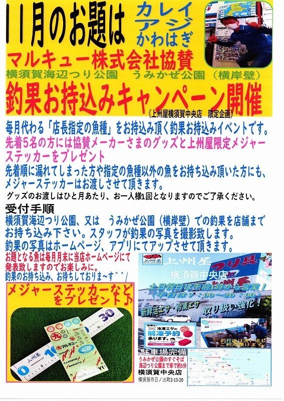 釣り方は当店でも人気ナンバーワンの「ツイストスキンケイムラレインボーサビキ」でアジの反応が無くなった後にクロダイがヒット!アジはクロダイに蹴散らされてしまったんでしょうね~。NYさまには株式会社マルキュー協賛「横須賀つり公園釣果お持込みキャンペーン」の11月お題のアジが含まれていましたのでグッズをプレゼントさせて頂きました。