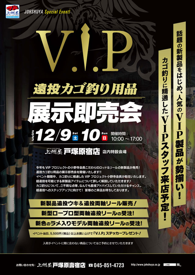 上記週末2日間、上州屋戸塚原宿店にて遠投カゴ釣りのパイオニア「VIPプロジェクト」の展示即売会を開催します!
