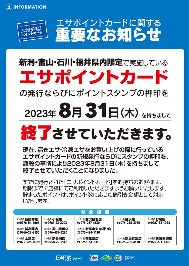 現在お手持ちのエサポイントカードは、なるべく期限までにサービス対象店舗(新潟・富山・石川・福井県内各店)にてご利用頂きますようお願い申し上げます。