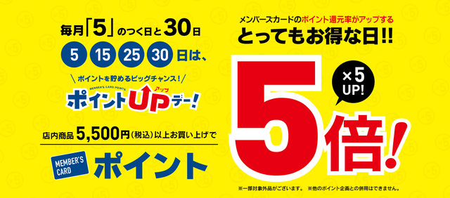 ※ポイントアップ特典を受けるには、その日のお支払いご精算が前提となります。その他適用条件につきましては、店頭スタッフまでお気軽にお尋ねください。