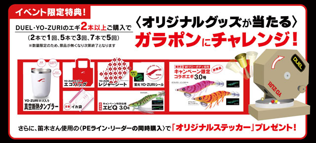 DUEL・YO-ZURIの対象エギを2本以上ご購入で、様々なオリジナルグッズが当る!ガラポンに挑戦頂けます!さらに笛木さん使用の「PEライン・リーダー」の同時購入で「オリジナルステッカー」プレゼント!