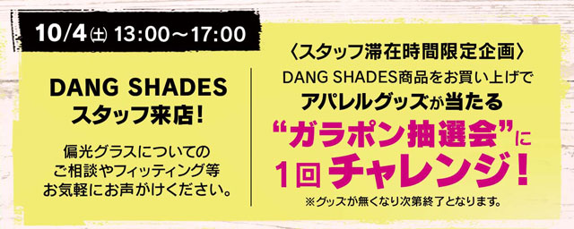 10月4日(土)13:00~17:00の時間帯には、ダンシェイディーズ・スタッフ来店!偏光グラスについてのご相談やフィッティングなど、気軽にお声掛けください!
