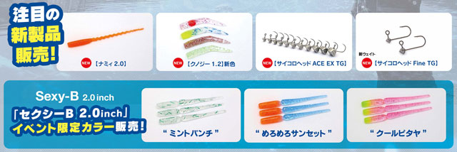 注目の新製品「ナミィ2.0」「クノジー1.2(新色)」「サイコロヘッドACE EX TG」「サイコロヘッドFineTG」や、「セクシーB」イベント限定カラー“ミントパンチ”“めろめろサンセット”“クールピタヤ”などを販売!