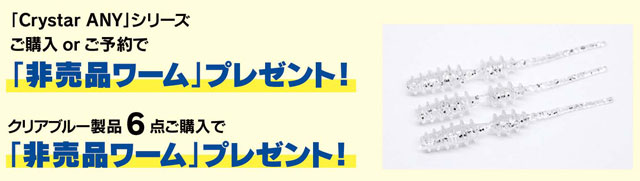 今回イベントにて「Crystar Any」シリーズをお買い上げ、もしくはクリアブルー製品を6点以上お買い上げで、「非売品ワーム」をプレゼント!