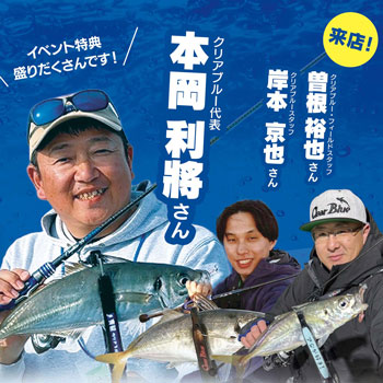 当日は“クリアブルー”代表、本岡利將さんとスタッフ岸本さん、フィールドスタッフ曽根さんがアドバイザリースタッフとして来店!クリアブルー製品について詳しく解説頂くのはもちろん、新製品ロッドの展示受注、オリカラワームの販売も行います。