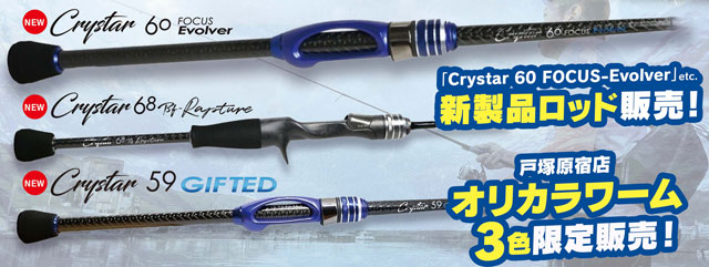 今年の新作ロッド【Crystar60FOUCUS-Evolver】【Cryster68BF-Rapture】【Cryster59GIFTED】をイベントにて展示販売!本岡代表の解説付きでご覧いただけます!
