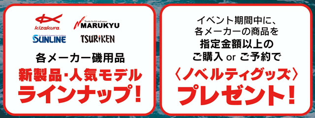 「キザクラ」、「サンライン」、「釣研」、「マルキュー」の磯フカセ人気アイテムが一堂に集結!2025年秋冬新製品を含め、各社自慢の人気モデルを幅広くご覧いただけます!対象商品のお買い上げやご予約に応じてノベルティグッズのプレゼントも!