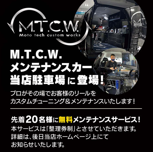 さらにリールカスタム、メンテナンスメーカーM.T.C.W.のメンテナンスカーが店舗入り口に登場!プロがその場でお客様のリールをカスタムチューニング&メンテナンスいたします!(先着20名様に無料メンテナンスサービス/整理券制)