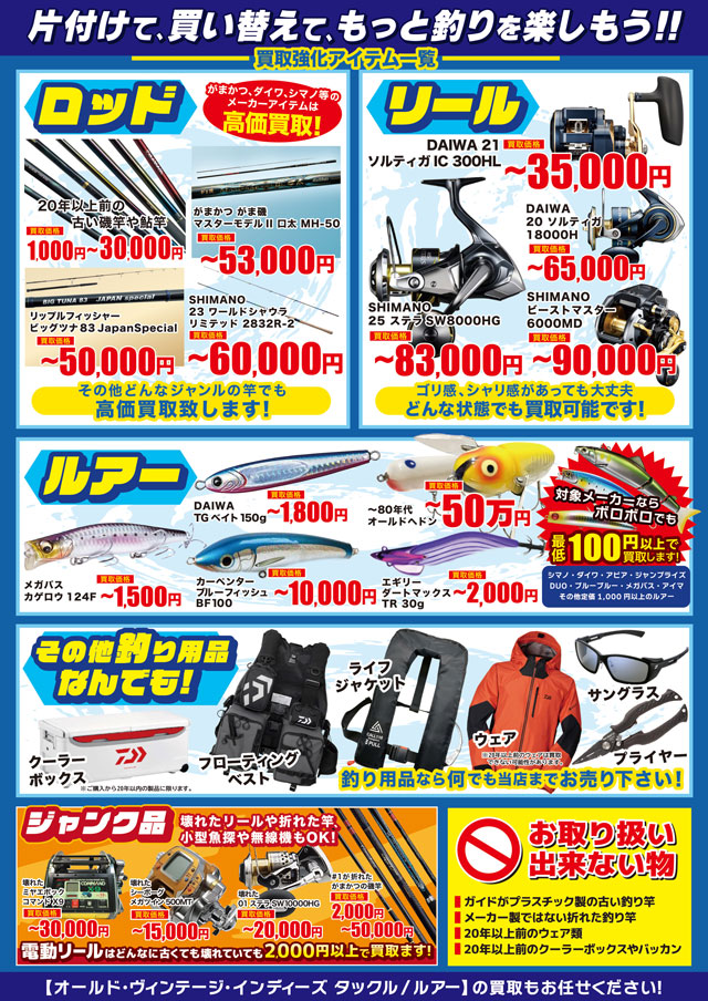 がまかつ、ダイワ、シマノ等のメーカーアイテムは高価買取のチャンス!リールはゴリ感、シャリ感があっても大丈夫!オールド・ヴィンテージ・インディーズタックル&ルアーの買取もおまかせ!