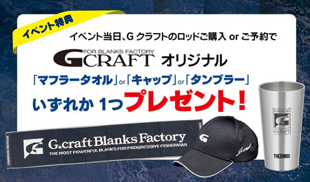 今回イベントでジークラフトロッドをご購入またはご予約で、ジークラフトオリジナル「マフラータオル」or「キャップ」or「タンブラー」いずれか一つプレゼント!