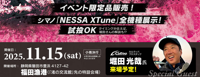 当日はスペシャルゲストとして、カルティバ・プロスタッフ堀田光哉さんが来場予定!さらに大会参加者の方向けにイベント限定品販売や、シマノNESSAXTune全機種展示&試投体験なども実施します!