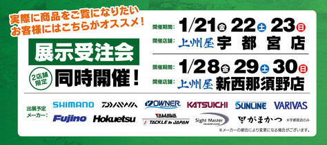 ※実際に商品を展示しての予約受注会は1月21日(金)、22日(土)、23日(日)上州屋宇都宮店、1月28日(金)、29日(土)、30日(日)上州屋新西那須野店、2店舗限定となります。※新西那須野店ではがまかつロッドの取り扱いはありません。