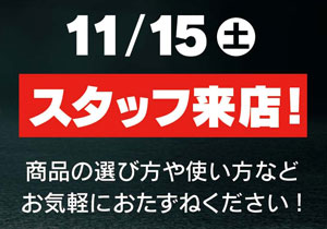 11月15日(12:00~17:00の時間帯には、アルファタックル&テイルウォークの営業スタッフが来店予定!店頭にてお客様に直接、展示製品の特長や釣りのアドバイス等をお話しします。是非気軽にお声掛けください!