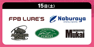 初日15日(土)は「FPBルアーズ」「なぶら家」「アンカーコア」「フォレスト」「ムカイフィッシング」。