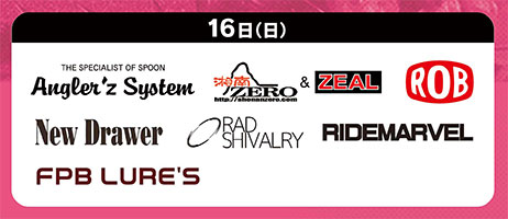2日目16日(日)は「アングラーズシステム」「湘南ZERO」「ZEAL」「ロブルアー」「ニュードロワー」「ラッドシバリー」「ライドマーベル」「FPBルアーズ」。