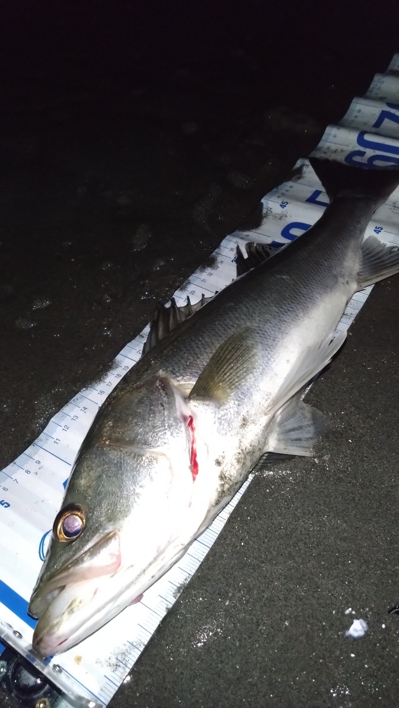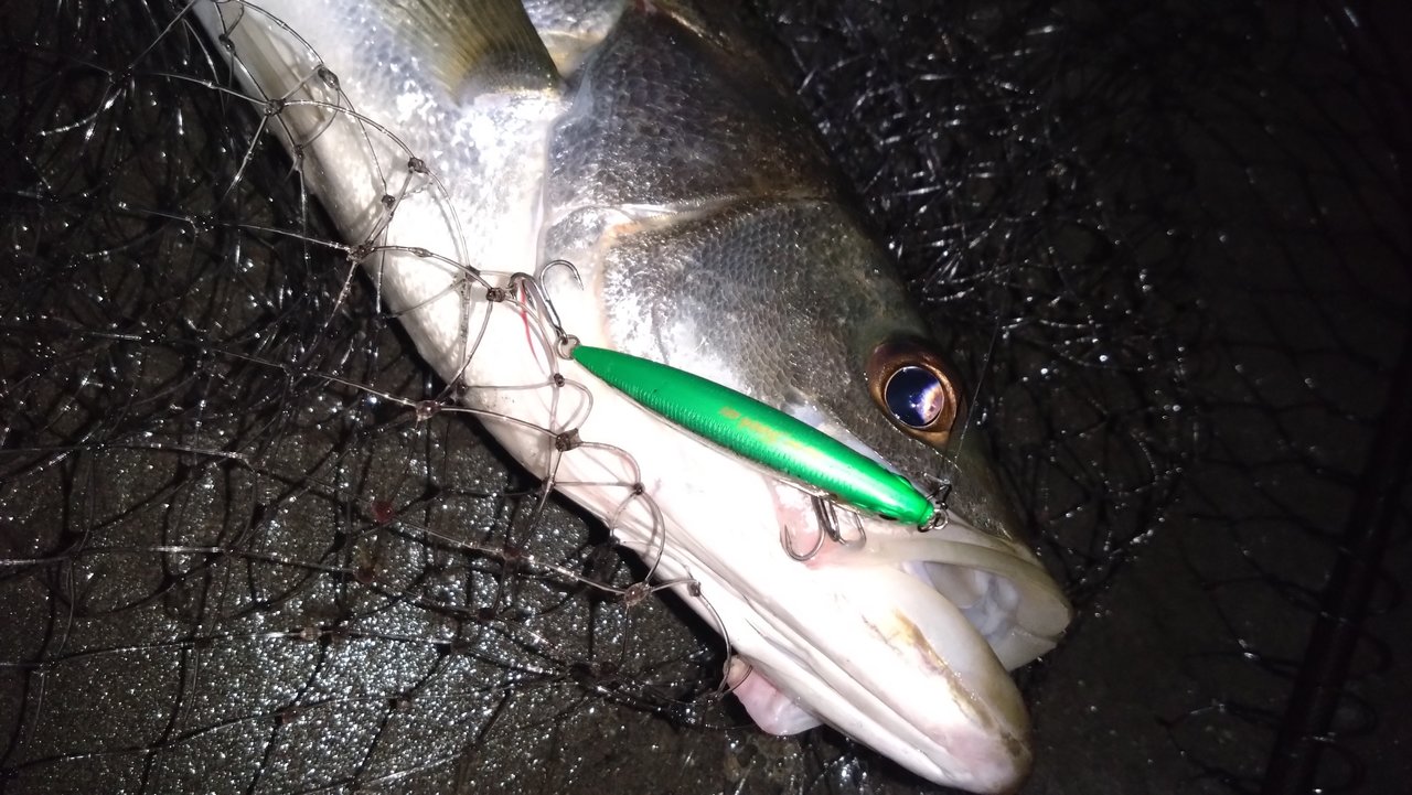 まずはスタッフ片岡が先行。明暗のあるポイントでまずはマーズ「R-32」で明るいポイントを探ってみますが反応がありません。その後【梯川ちゅるんちゅるん釣法】で暗がりのボトムをトレースしてくると前アタリからのヒット!60cmのシーバスをゲットし【梯川ちゅるんちゅるん釣法】の威力を再認識する事となりました。