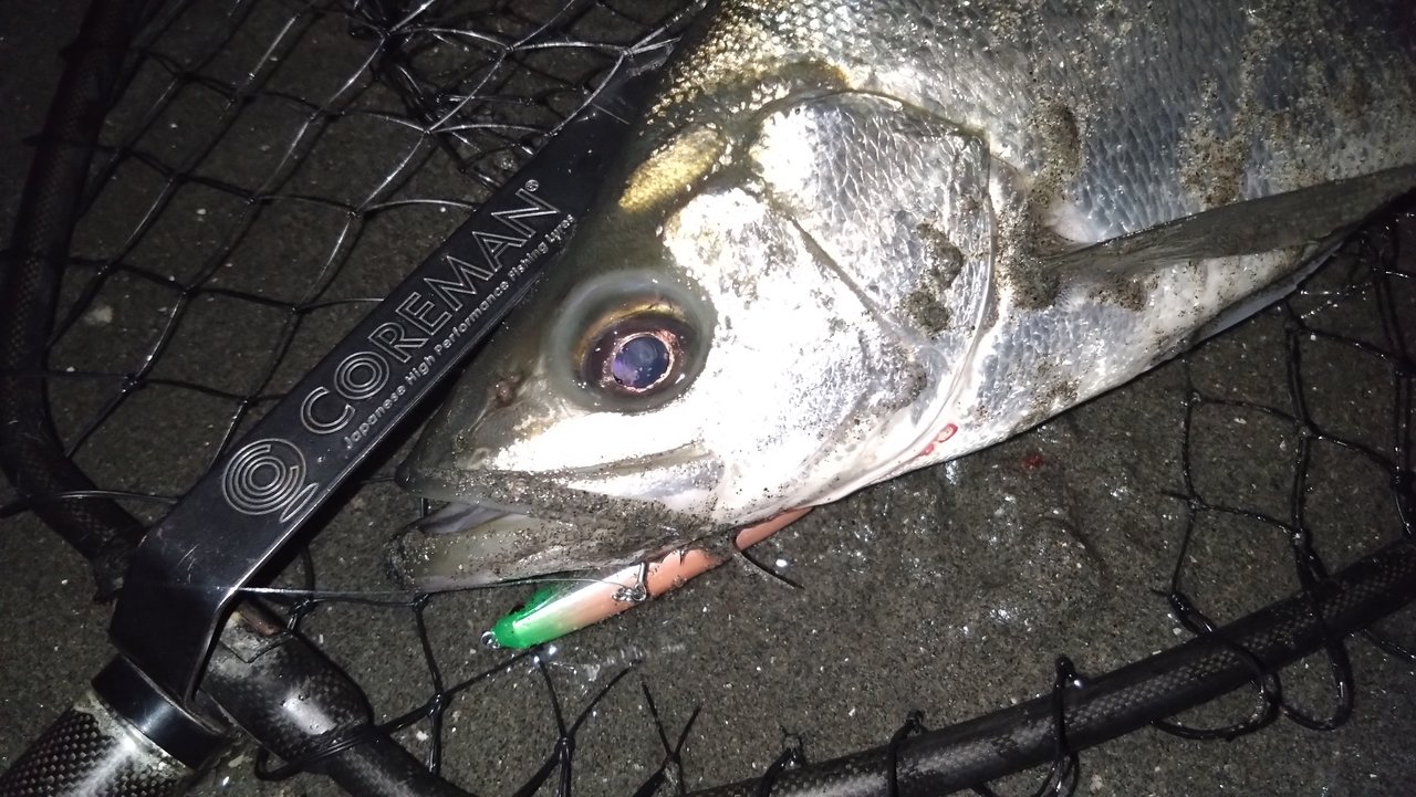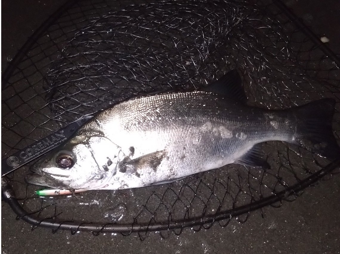 後発スタッフ美濃崎は下流部にエントリー。開始2投目ピックアップ寸前でシーバスがヒットしますが即バラシ。。その後はアタリなく逃がした魚を悔やむ時間が過ぎますが、1時間半ほど後に巻いていたコアマン「アルカリシャッド」に小さなアタリがでます。同じコースをゆっくりと通してみると見事ヒット!ランディング前に手こずりましたが72cmのシーバスをキャッチする事ができました!
