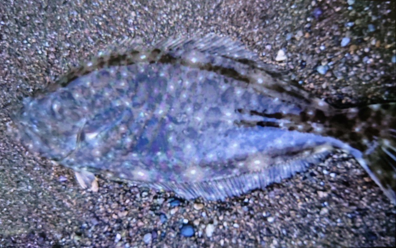 着水点から引いてくると泥質のボトムから玉砂利に変わる場所に差し掛かったのでシェイクしては止めるを1分ほど続けると待望の金属バイト!