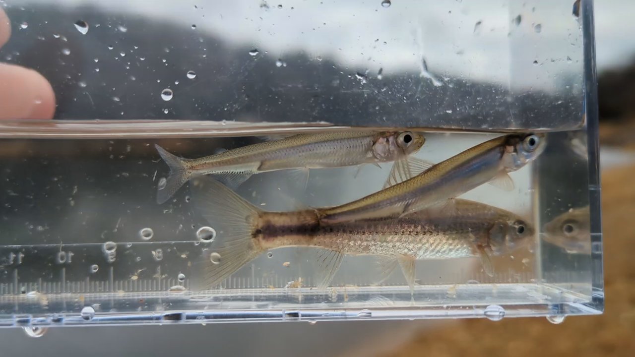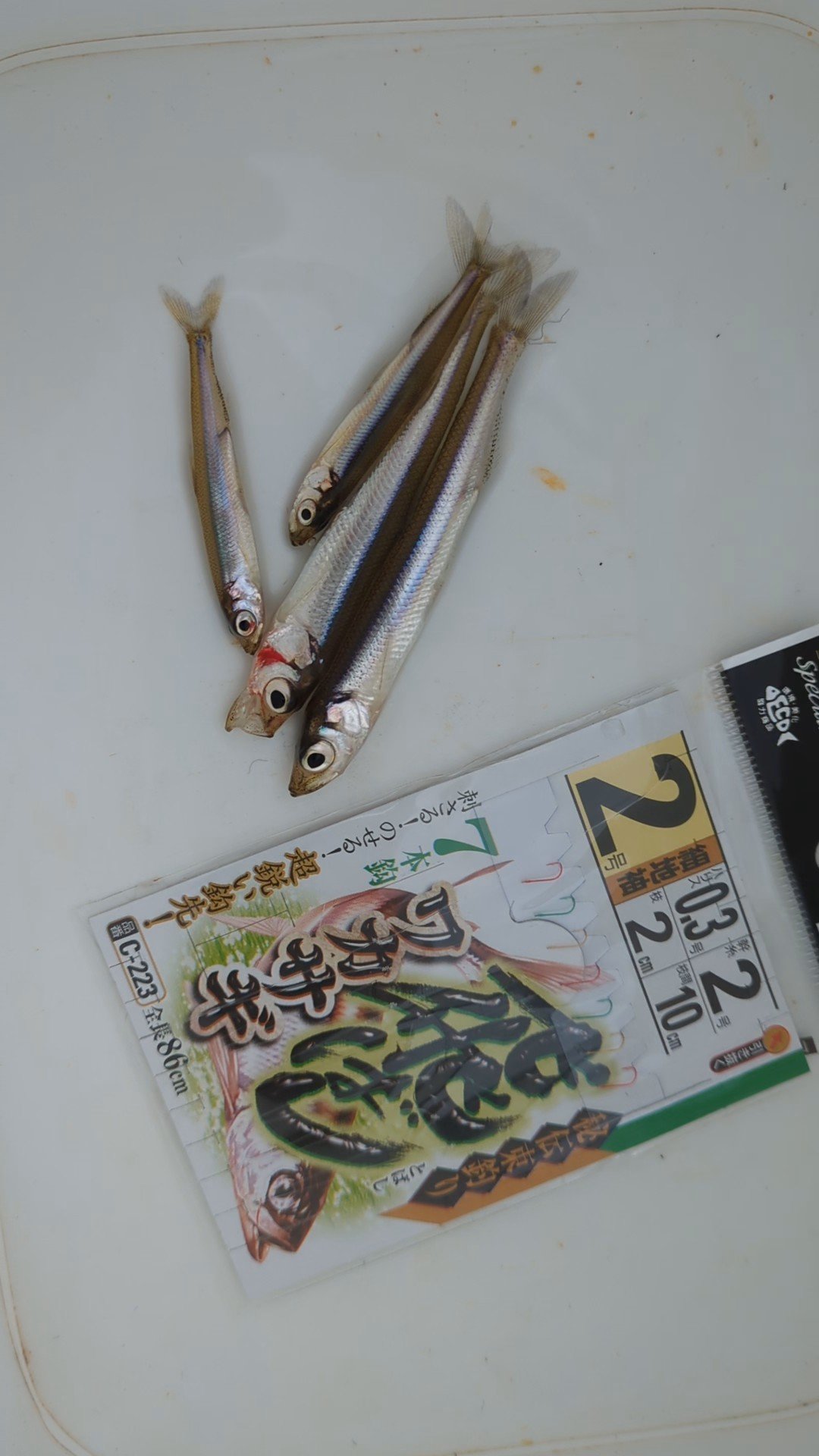 適当に30メートル位投げて着底させてアタリを待つ、すぐに反応があるが上げてみるとモロコ。次投はブルーギル(水温がまだ高いか)モロコ3連続を挟んでやっと本命のワカサギがヒット!同じような場所に投げるが連続は無くまたブルーギルとモロコ、投げる位置を少し変えたらワカサギがヒットするが単発。雨も止み風が強いし寒くなってきて、ラスト1投決めたらワカサギがWヒット!!で今日はここまでとした。