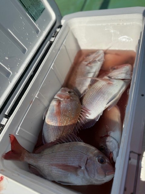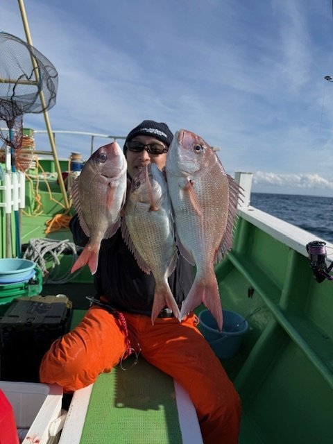 船内でポツポツ、真鯛が掛かり出し、1Kくらいの真鯛を数匹追加。