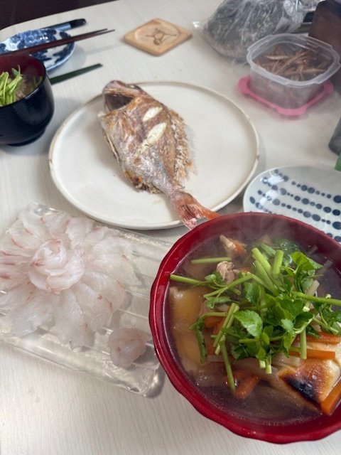 お正月はお雑煮、真鯛の塩焼き、ヒラメのお刺身。