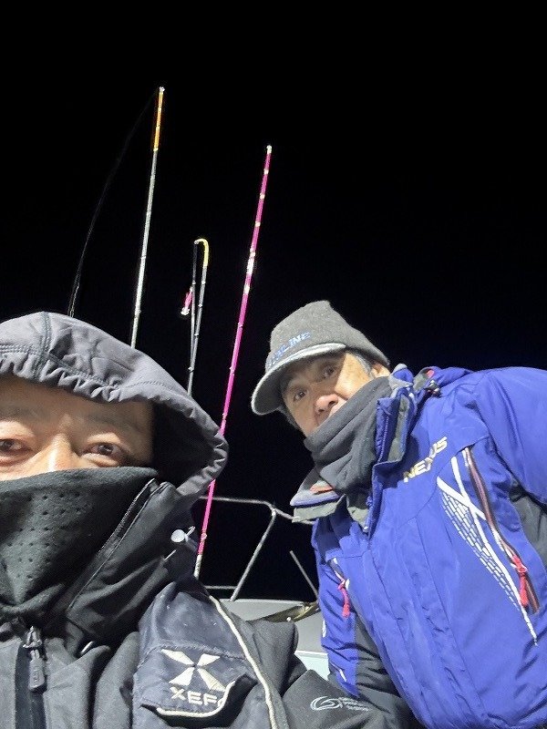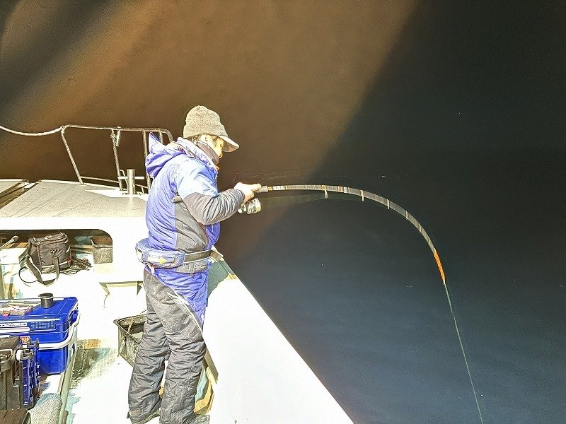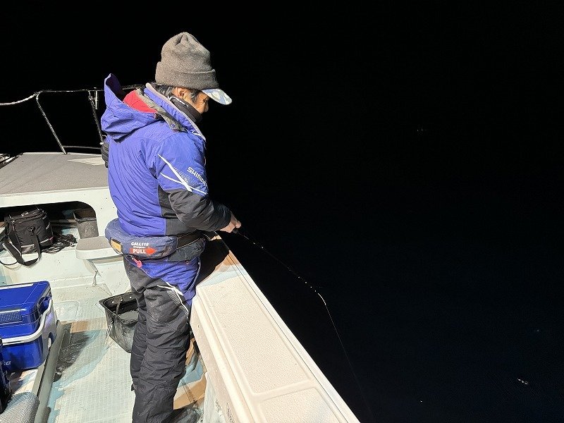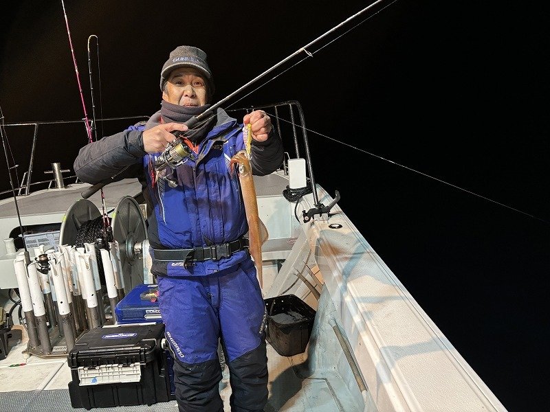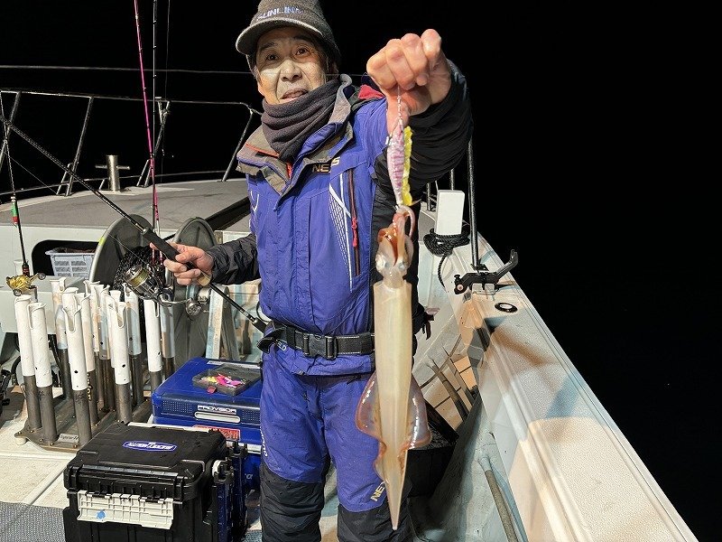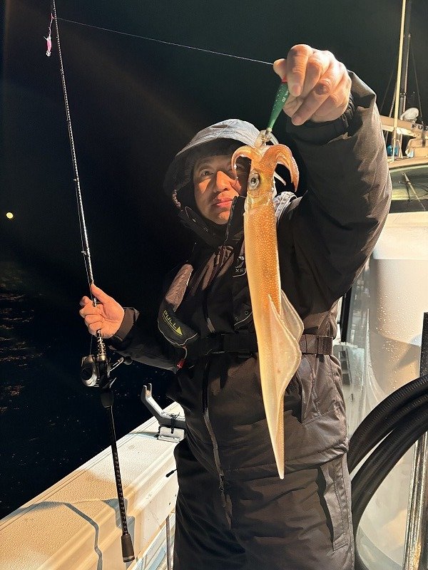 スタッフ高橋で~す!お客様と南伊勢は礫浦の三吉丸さんにて、イカメタル半夜便に乗船してきましたよ!防寒対策は万全の体制で挑みます。夕方5時半前に出船、6時ポイント着。ハイどうぞ!の合図で投入開始!早速後ろの方にヤリイカ!こちらも慌てて投入!潮が速いので鉛スッテは25号です・・底に着いたらゆっくりと竿を上げ、吊り下げ落し・・ステイ・・を底スレスレで繰り返すと・・竿先がヌン!ステイ10秒できましたよ!慎重に巻き取る・・まぁまぁ重たい・・あと少し・・ピッピッピ~でヤリイカ登場!恥ずかしながら初めて釣ったヤリイカ!長細っ!その後船中ポツポツ上がっています。お客様はオモリグで黄色いササミをエサ巻きスッテに巻いて・・釣った!ヤリイカ~!そして更にもう1ハイ!さぁ!調子が上がってきましたよ!どんどん行こう!と盛り上がってきましたが・・その後沈黙・・船中アタリが止まります。船長からは浅いレンジに反応出てますよ!とのアナウンス。周りではアカイカが釣れ出しています。お客様にもアカイカ!僕は・・パン!竿先が叩かれた!次は掛ける!集中・・集中・・掛けた!よっしゃー!で慎重に巻きます・・船長も隣で撮影の為に待機・・緊張するなぁ・・ピッピッピ~でアカイカ登場か?・・ええええええ~!サ・バ・フ・グやないか~い!・・という訳で極寒の中で頑張りましたが追加は叶わず終了となりました。今夜は月がきれいだなぁ・・見事な満月・・エリア全体的にテクニカルナイトとなりました。次の新月に期待しています。