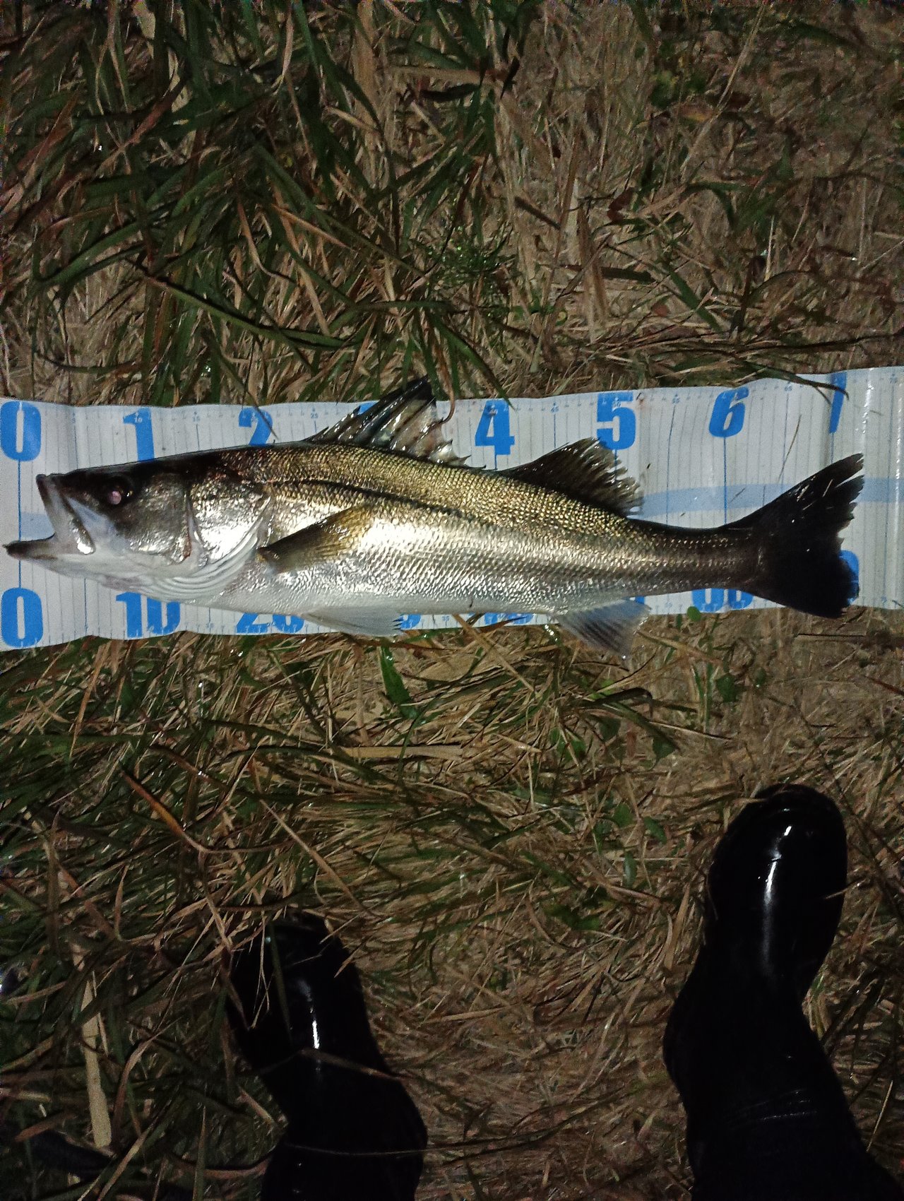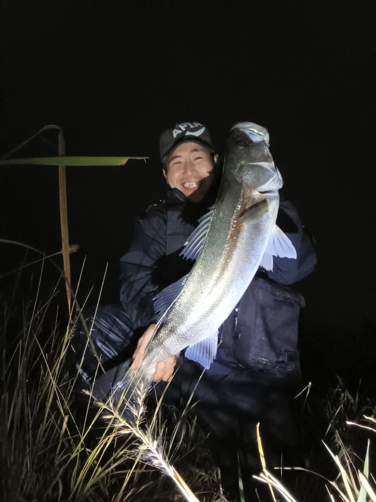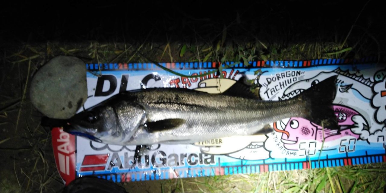 まずはスタッフ片岡が先行。明暗のあるポイントでまずはマーズ「R-32」で明るいポイントを探ってみますが反応がありません。その後【梯川ちゅるんちゅるん釣法】で暗がりのボトムをトレースしてくると前アタリからのヒット!60cmのシーバスをゲットし【梯川ちゅるんちゅるん釣法】の威力を再認識する事となりました。