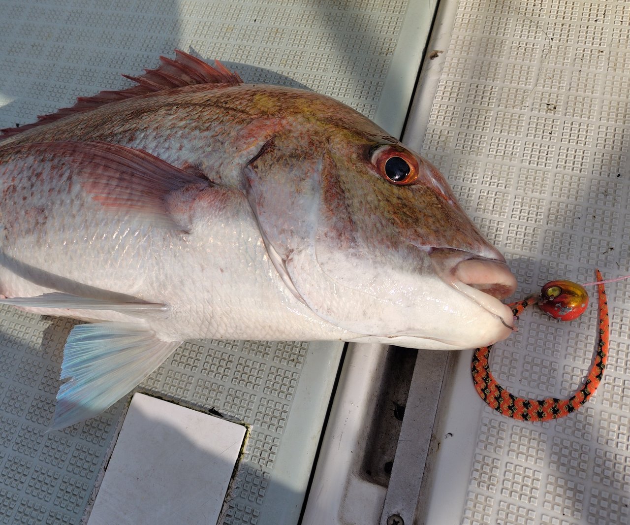 ゆっくり巻き上げて誘うがコツコツのみ。反転を促すためにスロー巻きに替えたとたん一瞬強く引くが慌てずに1回目をスルーしもう一度巻き上げてからのスローを試すと今度は一気にラインが出されたのでフッキング!しっかり掛かりマダイとわかる気持ちいい叩く引きを味わいながらゆっくり浮上させてキャッチしたのは3kgジャストのマダイでした。