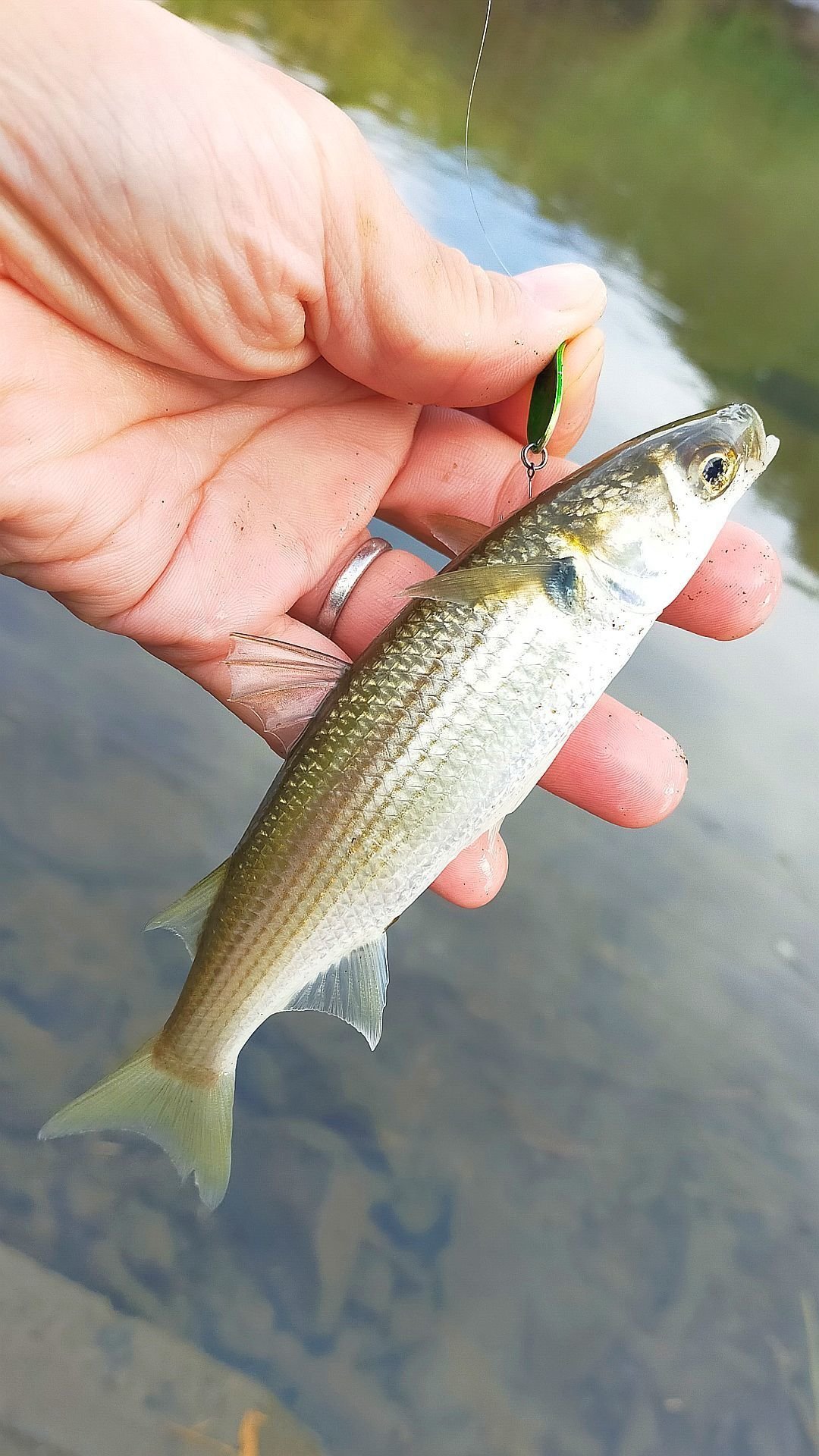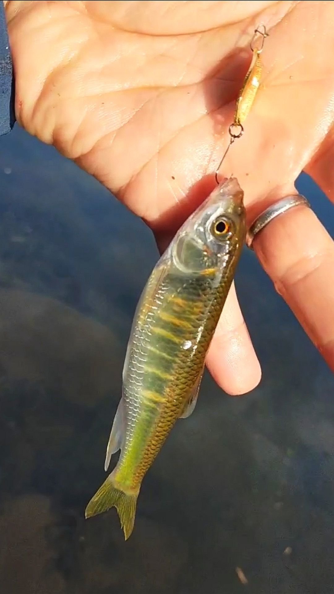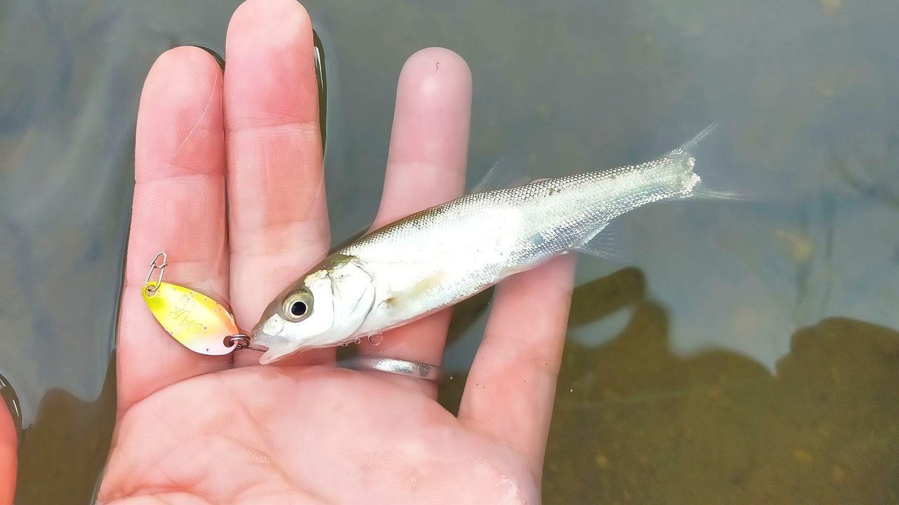 ノアジュニア1.2gで水面を引いてくると幸先よくきれいなオイカワが釣れてくれました。