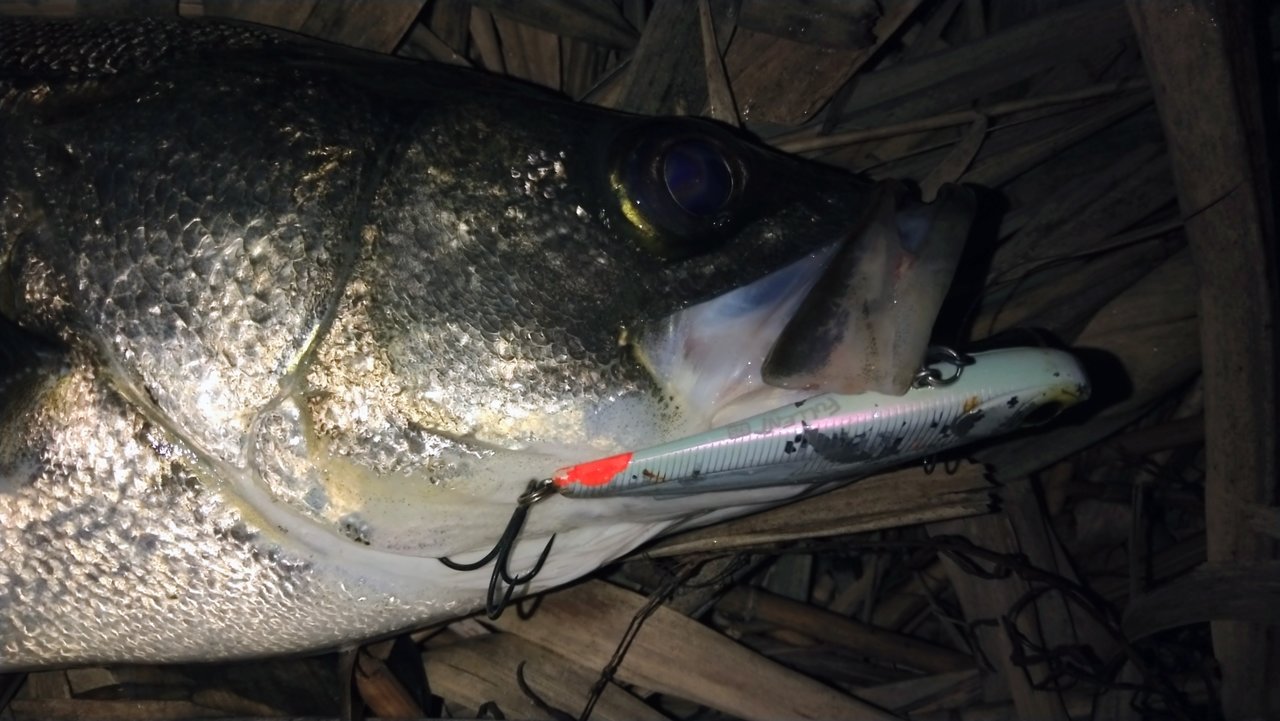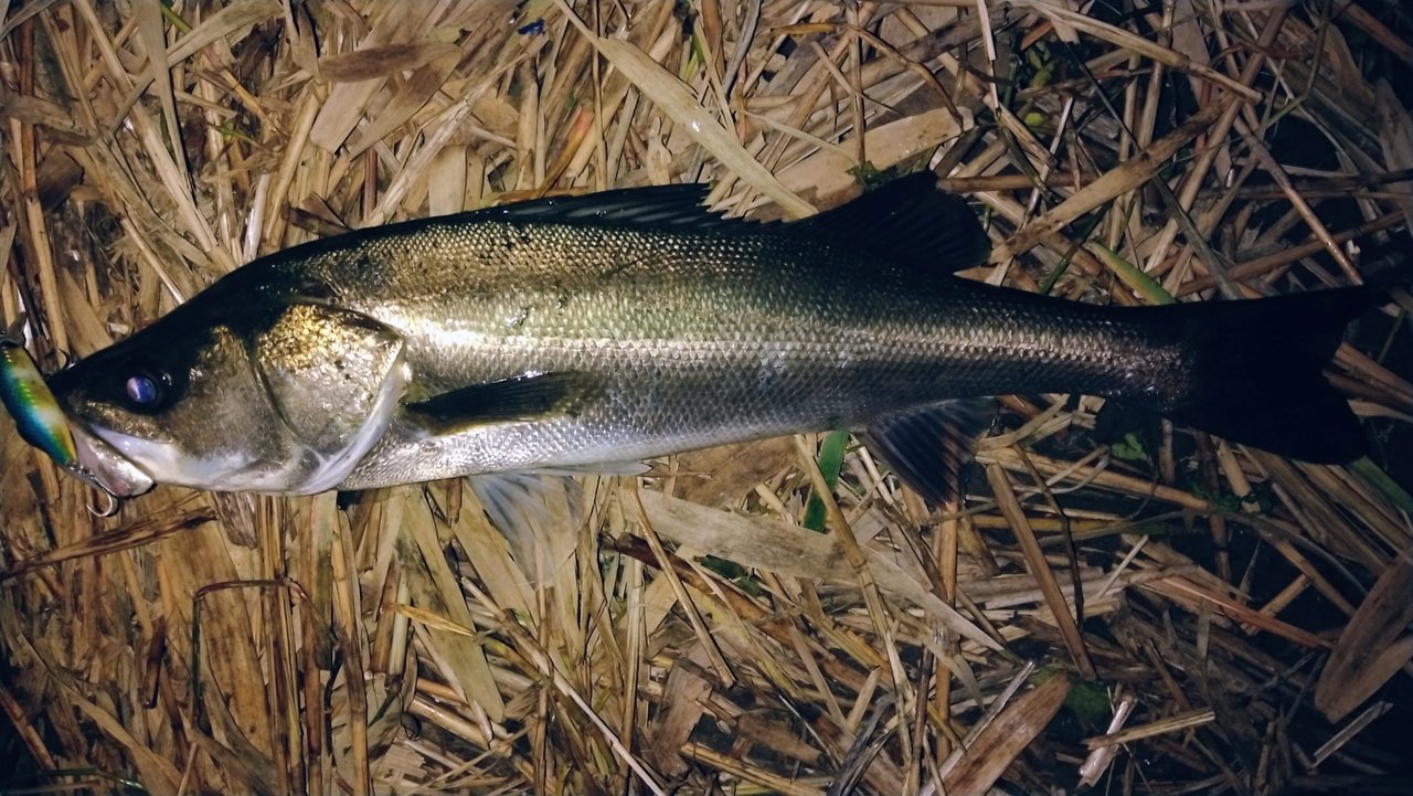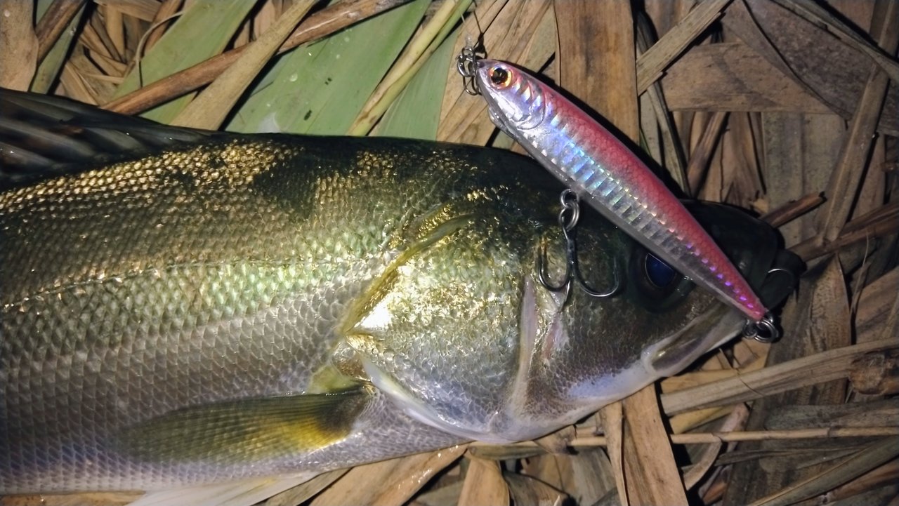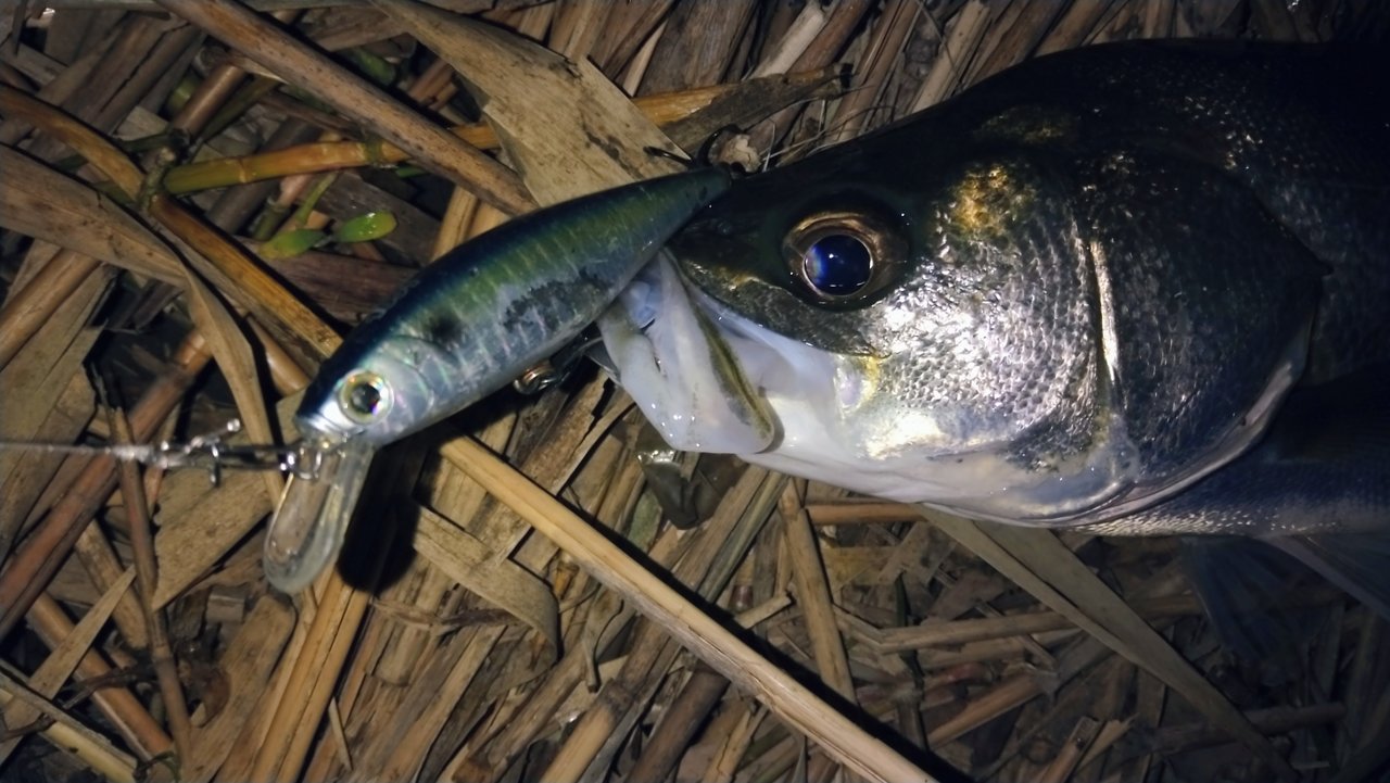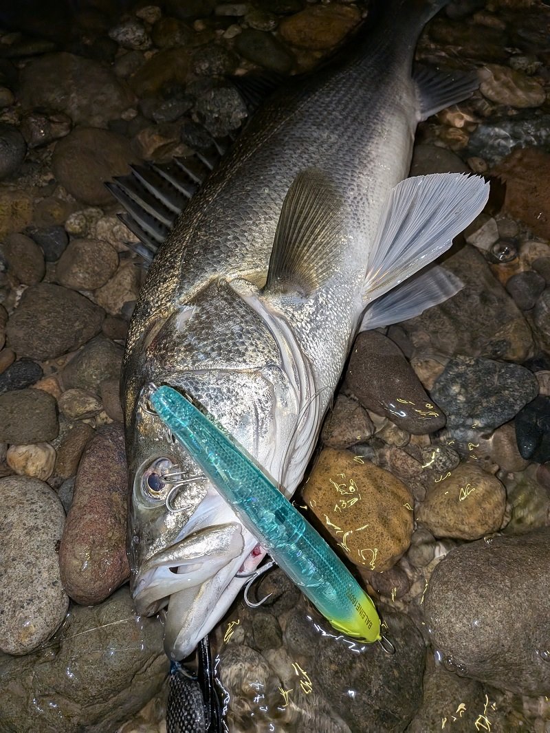 ポイント到着が22時。前夜の状況から、7cm程度の上げならすでに惰性の下げが勝って、それなりに下げが効いているだろうと早めにポイントへ。それでも同じことを考えて常連の先行者さん。しかし、思ったよりも最後の最後に上げが効いているのか、気づくと潮位が上がている。先行者さん、待てずに撤収。それでもまだ下げがまともに入らない。23:30頃ヤット沖にシッカリした筋が入ったタイミングで、フルエント82Sを入れると65UP!!これから本番かっ!?と思うと、後が続かず単発終了。日付が変わって少しづつ下げがまともに入ると、筋にサカナが付く。しかし、前夜までの多数いる感じでもなく、ポツポツ筋の拾い釣り。手前の筋のイナッコ?ざわついた下にイルヤツをビーフリで2本。その後、チョイ先の筋をミニエント70Sで3本、沖の筋をレビンヘビーで。さらに連日の雰囲気から波動があったほうが??とフラペンブルーランナーで3本。とこの頃からサカナ数が増えている感じでサカナの反応が多いエリアをフルエントで探しつつ、レンジ合わせでサルベージソリッド85ESで6本ほど、手前のちょい浮き気味はキックビート20gで2本、沖の離れたらサルベージソリッド85ESで2本、手前でイナッコ&サッパについているヤツをオグル85SLMでジャークステイジャークで5本、沖の筋をサルベージソリッド85ESで2本、手前に筋が寄ってミニエント70Sで、手前のベイト付きをベイソールミノー73Sで、再度ミニエント70Sで、最後の最後5時を過ぎたあたりからサカナの気配が薄くなり、その中でキックビート20&で40前後を5本かけて、これ以上やってもサイズが上がらないと、5:30で終了。