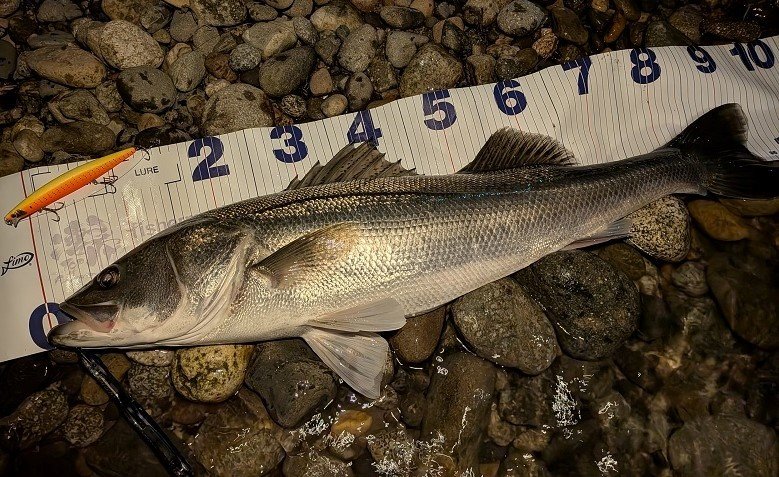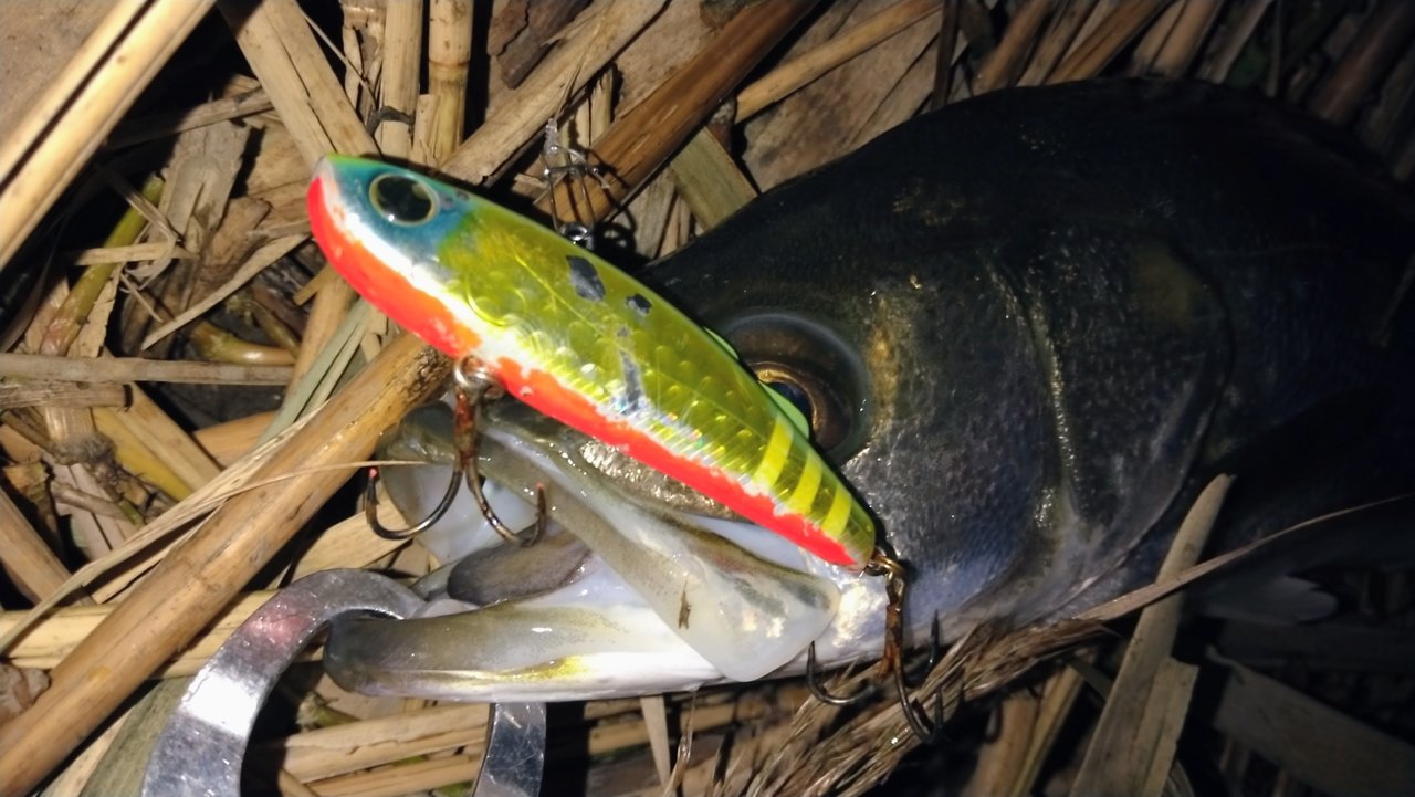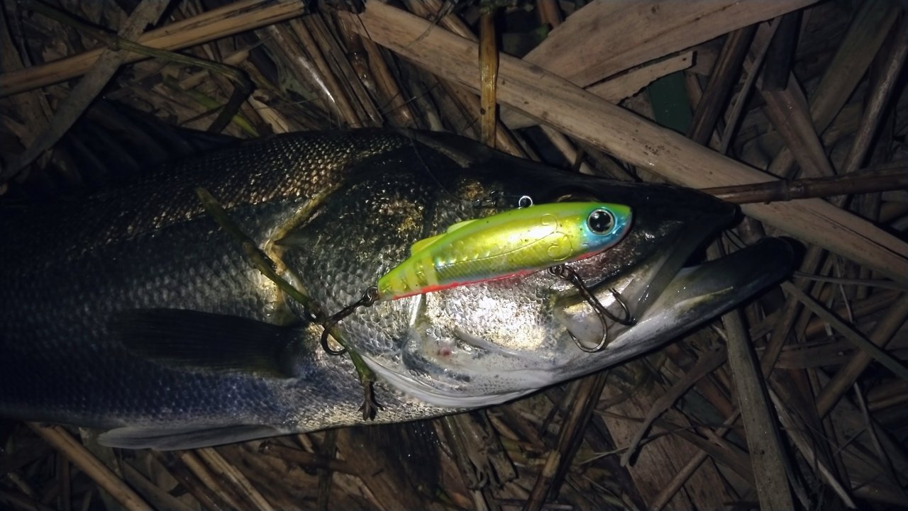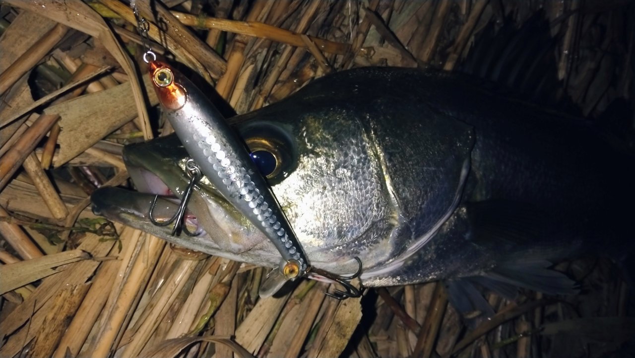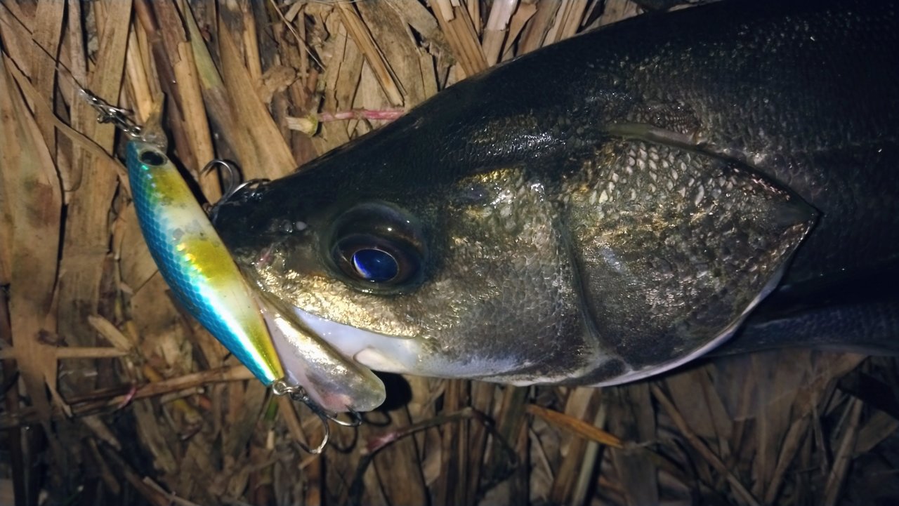ポイント到着が22時。前夜の状況から、7cm程度の上げならすでに惰性の下げが勝って、それなりに下げが効いているだろうと早めにポイントへ。それでも同じことを考えて常連の先行者さん。しかし、思ったよりも最後の最後に上げが効いているのか、気づくと潮位が上がている。先行者さん、待てずに撤収。それでもまだ下げがまともに入らない。23:30頃ヤット沖にシッカリした筋が入ったタイミングで、フルエント82Sを入れると65UP!!これから本番かっ!?と思うと、後が続かず単発終了。日付が変わって少しづつ下げがまともに入ると、筋にサカナが付く。しかし、前夜までの多数いる感じでもなく、ポツポツ筋の拾い釣り。手前の筋のイナッコ?ざわついた下にイルヤツをビーフリで2本。その後、チョイ先の筋をミニエント70Sで3本、沖の筋をレビンヘビーで。さらに連日の雰囲気から波動があったほうが??とフラペンブルーランナーで3本。とこの頃からサカナ数が増えている感じでサカナの反応が多いエリアをフルエントで探しつつ、レンジ合わせでサルベージソリッド85ESで6本ほど、手前のちょい浮き気味はキックビート20gで2本、沖の離れたらサルベージソリッド85ESで2本、手前でイナッコ&サッパについているヤツをオグル85SLMでジャークステイジャークで5本、沖の筋をサルベージソリッド85ESで2本、手前に筋が寄ってミニエント70Sで、手前のベイト付きをベイソールミノー73Sで、再度ミニエント70Sで、最後の最後5時を過ぎたあたりからサカナの気配が薄くなり、その中でキックビート20&で40前後を5本かけて、これ以上やってもサイズが上がらないと、5:30で終了。