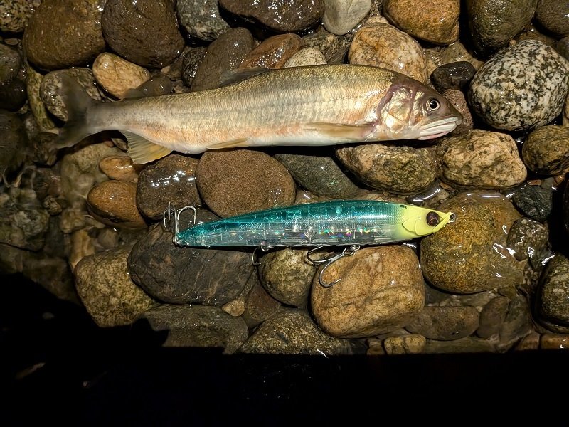 あまり釣れそうな気配を感じてませんでしたが、来る時は突然ですね。レスポンダーがいい仕事をしてくれました。(着水直後にウエイトが戻っている構造は流す時のルアーの姿勢に不安を感じないので使いやすいですヨ。)