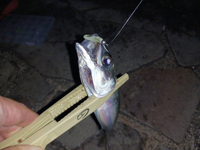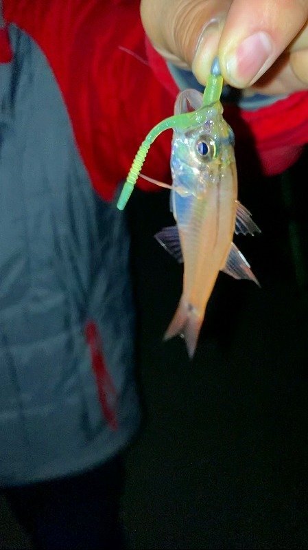 その付近に「1gジグヘッド+イージーシェイカー2.5in」をキャストすると、落ちパクバイト!15㎝のアジが釣れました!