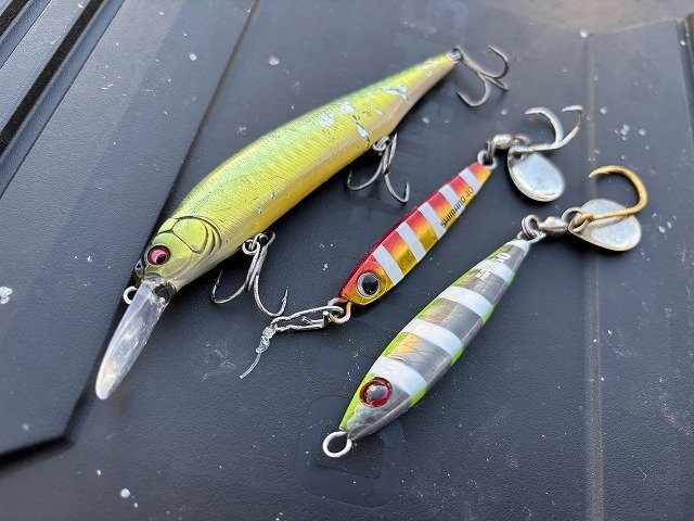朝は強風で波が高く釣りづらい状況でしたが、タングマンブレード40gで幸先よく1本目GET♪そこからは反応探しながら移動を繰り返し、船中ポツポツと釣れるもサゴシサイズ…。終盤に船長にミノーで釣れてると連絡が入りポイントへ急行!